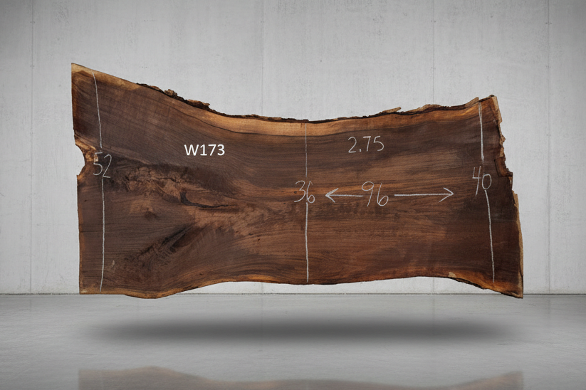 One of several gorgeous large Black Walnut slabs. This is an appealing one-piece tabletop walnut slab with an attractive edge. Suitable for one-piece tabletop for a dining table, desktop, wide bar, etc. Beautiful dark, rich color and grain in this slab! This slab has been air drying since February, 2021. Not kiln dried. Available for purchase and ready to ship now!